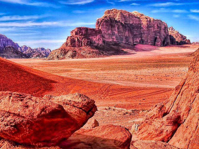 Breakfast. The road south from Petra leads down to Wadi Rum, another of nature's wonderlands that has attracted human beings for thousands of years. Wadi Rum is an unusual desert terrain that resembles a pastel pink lunar landscape, with towering limestone and granite cliffs shooting out of the sandy desert floor. In Wadi Rum which was known as "Lawrence of Arabia Land" time to ride a camel and join a jeep safari.